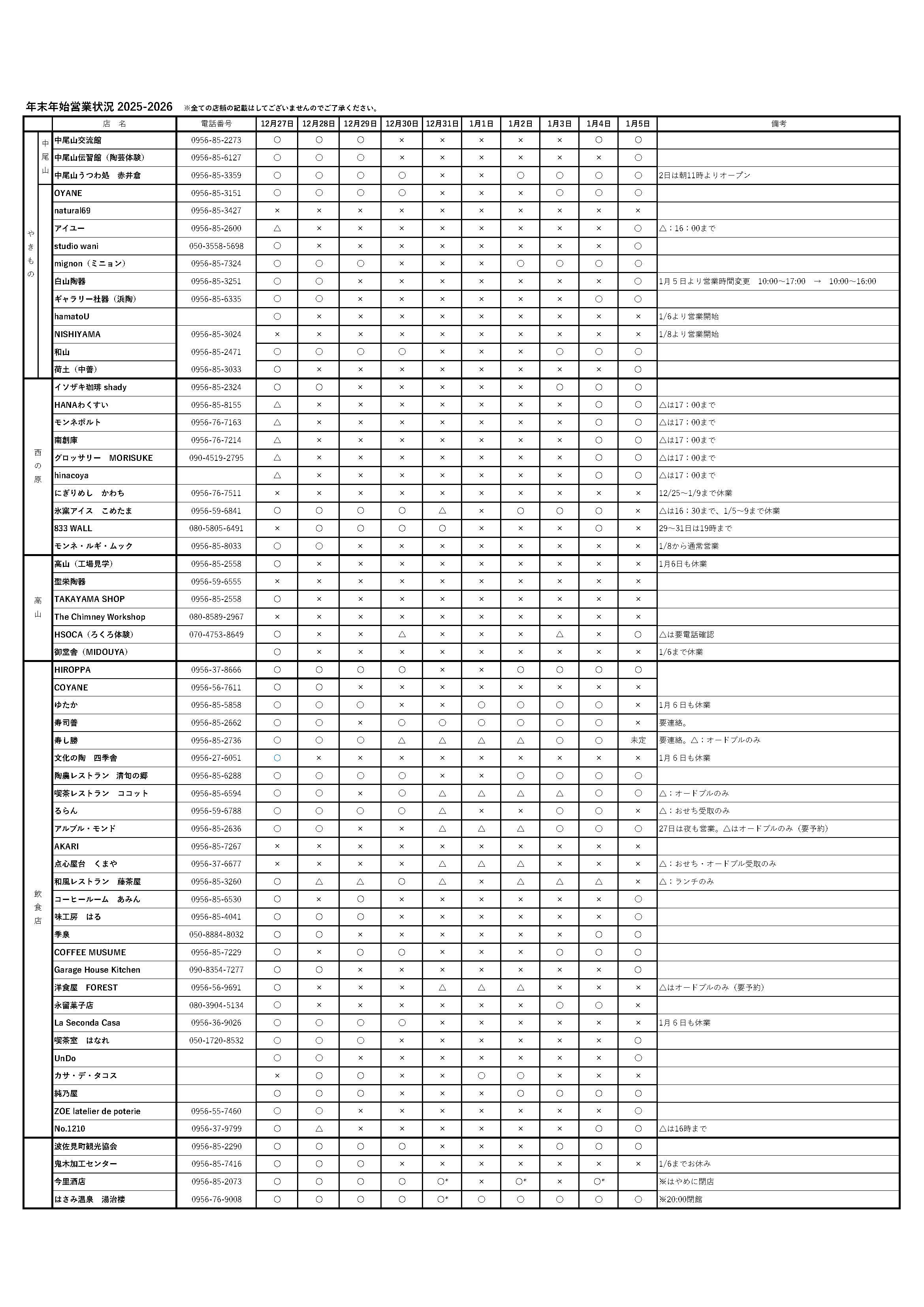 波佐見町内観光関連店舗・施設の年末年始の営業情報です。